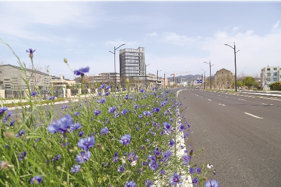 3月24日,在我市城北大道,一整排盛开的蓝花矢车菊在春风中轻轻摇曳,令人迷醉。旁边车道宽阔整洁、车来车往,不远处台州第一技师学院行政楼高高耸立,形成了一幅自然与人文交相辉映的美丽画卷。