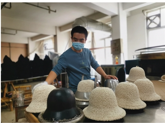 “那是一款针织定型帽。”陈永林说,“以前这类帽子折叠后会变形,所以很多人出门只能一直戴着。但是经过我们改良,不仅可以折叠,放在包包里随身携带,拿出来后依然有型有款。而且这款帽子还有一个好处,就是填补了夏季针织帽的空白。”