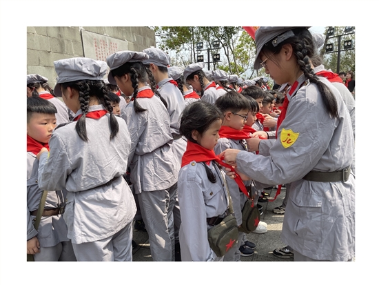 本报讯(记者江倩倩)4月1日, 坞根红军小学、九龙学校小学部、箬山小学、潘郎小学4所学校的148名一年级小学生在坞根红军小学“会师”,联合开展“传承红色基因,争做新时代好少年”分批入队活动,当一回小红军,重温一次红色记忆。