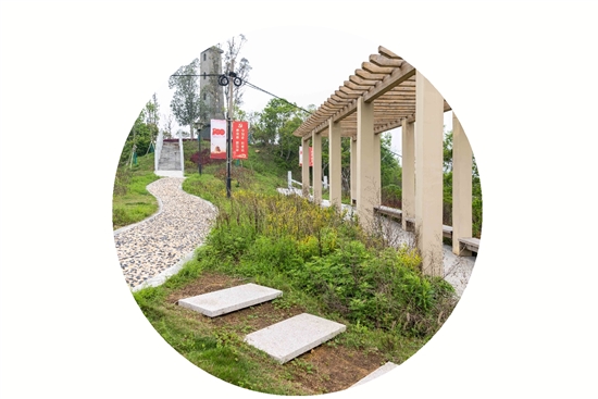 如今,陈列室内一改10年前的简陋面貌,成了活动室和阅览室。原来的老旧木窗,换上了不锈钢落地门。小广场旁,文化礼堂建成,窗明几净,陈列着烈士们的事迹介绍。上岸山红色公园的面积也得到进一步扩大。从原来的山顶一隅,到如今的整山皆是公园,上岸山“颜值”大提升。荒草丛生的山体如今规划有序,环山石阶如飘带缠着山体盘旋而上,两侧绿化怡人,还设了不少石凳供村民休憩。烈士碑下人气更足了,村民们在纪念先烈之余,也向烈士们展示着现在的新生活。