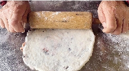 这时,店里来了一位上了年纪的阿公,刚坐下,阿姨就揉起面团,厚厚地包裹着肥肉,揉捏好贴炉里。经过一番等待,一张比普通梅干菜饼厚上一倍的烤饼熟了,阿姨切成小块,递给阿公。阿公默契地接过,转身回到长凳上坐着,狼吞虎咽地吃完,摸摸肚子,高兴地付了钱离开。