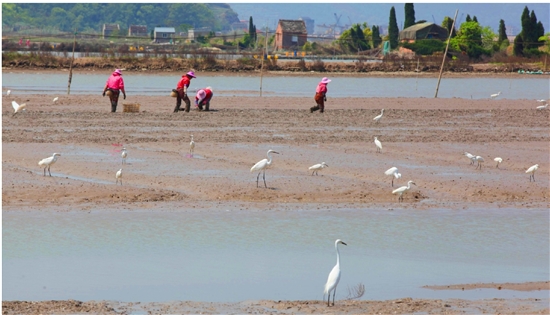 4月10日,坞根镇白璧村海水池塘养殖户正组织工人在七一塘采收青蛤,白鹭围在采蛤女工周围觅食,形成一幅人鹭和谐共处的美丽画面。该养殖户去年放养青蛤时,采取严格清塘、全面搁塘和合理密殖等科学管理措施,今年采收获得亩产近万斤青蛤的好收成。