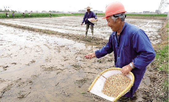 4月10日,在新河镇秧田村,农民在稻田里直播早稻。随着气温回暖,我市农民抓住晴好天气,陆续开始十多万亩早稻春播春种,其中省时省力的直播占了七成,田间地头一派繁忙景象。