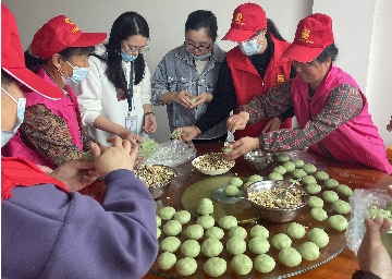 清明节当天,在寺基沙村,十几名志愿者在银行工作人员的组织下围在一起包青团,场面很是温暖。青面团,当地妇女炒制的馅料,工作人员用爱心包出来的青团,清香十足,带着暖暖的温情。不多久,案桌上的托盘中,摆满了绿色的青团,煞是好看。