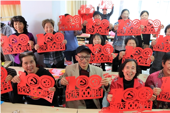 图为太平街道尚书坊社区的居民们展示建党100周年主题剪纸作品。