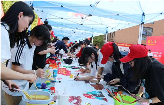 现场,参与者们联手用手中的画笔描绘出一幅幅壮丽的画面,以此庆祝中国共产党成立100周年,纪念中国共青团建团99周年、“五四”运动102周年。 记者 姚天摄