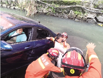 6时52分,消防救援人员抵达现场,蓝色小轿车的车头勉强卡在河岸的泥土中,下半个车身已经没入河中,并有摇晃现象。了解现场情况后,指挥员立即下达作战命令,指战员穿戴好个人防护装备,利用单杠梯,在岸边和落水车辆之间架起了一条救生通道。经过15分钟的紧张救援,被困人员全部救出。