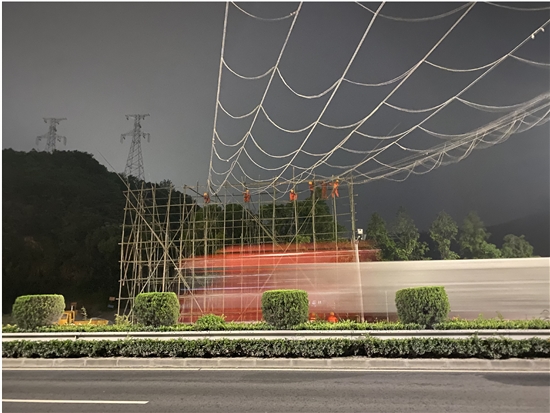 考虑到大石松一级公路车流量很大,所以这次封网作业就安排在了车流量相对较少的凌晨。当天凌晨,电闪雷鸣,狂风暴雨,当很多人被雷声“叫醒”时,跨越架搭设施工人员正在紧张地操作。“还好抢在雷雨前完成施工,没有影响进度。”傅伟峰说,看上去作业只用了10分钟左右,但前后准备了3个小时,这还不包括花三四天时间架设起来的毛竹架。