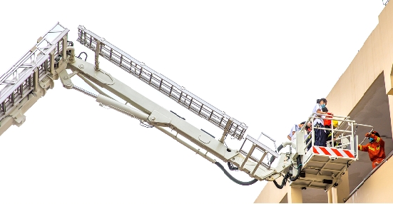 演习中,最震撼的莫过于云梯救援和高喷车高空作业的场景,冲天的水柱有效地控制了火势。而后消防云梯车立即启动,随着曲臂一截一截地展开,云梯缓缓上升,逐渐接近“被困人员”。当“被困人员”走出云梯车的那一刻,人群中爆发出了经久不息的掌声。