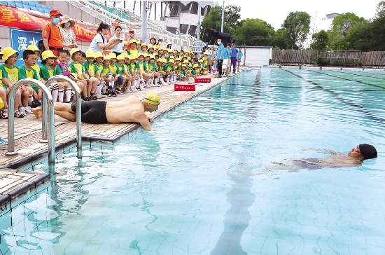图为在泳池边,志愿者告诉孩子们,抢救溺水者时,救援者能在岸上尽量不下水,能卧倒不要站着,能用器材不要人下水等常识。
