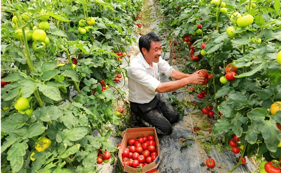 近日,在新河镇蔡施桥村田头,当地种植户陈宝法正在采收大棚番茄。近年来,我市在推进产业富民的过程中,采取 “基地+合作社+农户”等合作模式,大力发展特色蔬菜种植,推行规范化和标准化管理,培育出2万亩成规模、效益高的无公害绿色蔬菜产业园,让群众实现家门口就业,鼓了农民的“钱袋子”,助推乡村振兴。