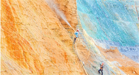 5月25日,坞根镇新方废弃矿山边坡锚固绿化修复工地,工人正攀援在岩壁边,给铺设过勾花钢丝网的边坡喷撒绿化种子和客土泥浆。