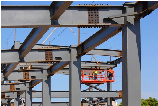 5月26日,石桥头镇沙角村,施工人员正在架设台州沙角110千伏输变电工程配电装置楼钢梁。