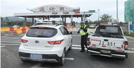在高速温岭南入口处,开道的交警们嘱咐杨先生要小心驾驶。杨先生对交警们表示了感谢。