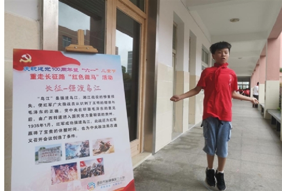 活动中,全校学生分红、蓝两队对抗,手持通关卡,依据长征微地图,依次闯关。在“瑞金”,孩子们需要分清国旗、党旗、队旗;在“湘江”,孩子们高唱国歌、队歌;在“遵义”,孩子们学习遵义会议知识;在“夹金山”,孩子们得回答党史知识;在“泸定桥”,孩子们得爬过长垫;在“延安”大会师时,“三军过后尽开颜”,成功的喜悦才是最好的奖品。