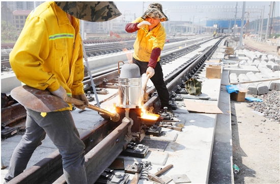 “铝热焊”是将两根钢轨端头固定在铸型内,把铝热剂放在坩埚内加热,使其发生还原放热反应,成为液态金属注入接头空隙,实现钢轨端头无缝连接。“铝热焊”无缝连接消除了接头振动噪声,保证无缝轨道上的车辆运行平稳、安全可靠,是技术性较强的焊接工艺。