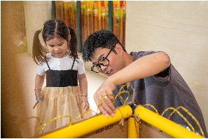 “霄哥,我不会用剪刀。”“霄哥,你看我剪得漂不漂亮。”……走廊里熙熙攘攘,原来是陈霄跟小班的孩子们在一起装饰“花车”。他蹲在花车边,一边剪纸,一边眼观四路,耳听八方,时刻关注着孩子们的一举一动。一个小朋友不会用剪刀,闹了脾气,陈霄立马耐心地劝慰她,并提供了一个解决的好办法。只见他双手紧紧拉住纸张,让孩子使用剪刀。两者配合默契,剪出了许多银色的贴纸,孩子的脸上也逐渐流露出笑意。