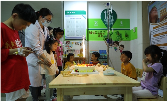 6月1日是国际儿童节,台州市肿瘤医院的儿科医务人员特意准备了蛋糕、面包,在病区读书角让住院患儿们快乐过“六一”。图为该院儿科主任王晔华和小朋友一起点燃蛋糕上的焰火。