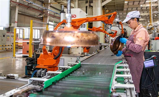 近日,东部新区爱仕达智能工厂内,机器人装配生产线正在赶制出口美国的订单,现场一片繁忙景象。开年至今,工厂订单一直处于饱和状态,订单数量与去年同期相比翻了一番。目前,企业正通过生产信息化、数字化和智能化,开足马力赶制订单,满足市场需求。