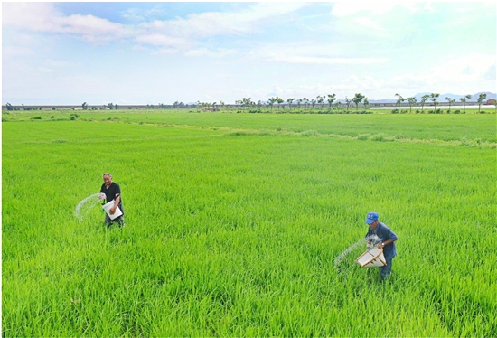 6月7日,东浦新塘,箬横镇种粮大户朱伯华正组织民工看苗补施平衡肥,确保早稻中后期生长养分需求。