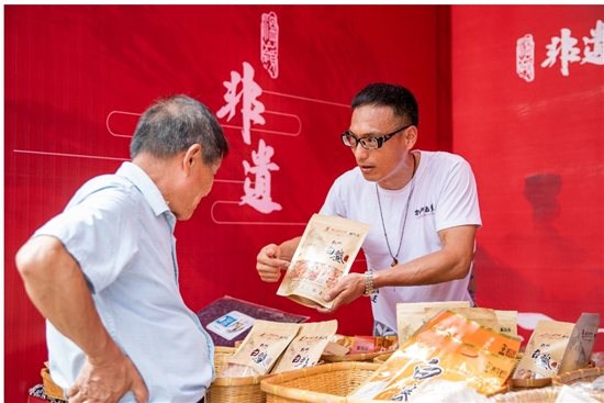 展销区域内松门白鲞、神童门硬糕、王味和传统糕点、桂花食品等琳琅满目的非遗产品让人流连忘返,吸引了不少食客驻足。