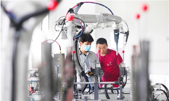 6月16日,浙江开邦建筑科技有限公司工程师正在调试工业焊接机器人。