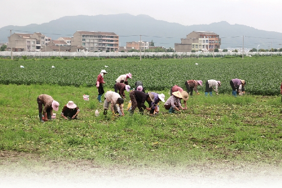 “那边人更多,老板也在那里。”根据小工指点,记者随后来到西殿庙南面两三百米的一丘田中,这里有更多的农妇在种豆。老板林国根在路边,正在卸下除草剂。记者和其聊天时,感觉老林比较低调,他在西汇头村包田已种了十多年,今年种了200多亩毛豆。毛豆一年可种两三季,种了毛豆后,还可以种雪菜。他说,前一天摘豆时,来的小工更多,有上百人,现在种豆只有五六十人,按小时计酬,打个电话就来了。这些农妇来自西汇头本村,还有箬横、石桥头镇的其他一些村。老林说,他种的毛豆销住温州,销路是不愁的,行贩会主动来收购。现在产量不高,亩产只有七八百斤(高的时候曾经超过千斤)。