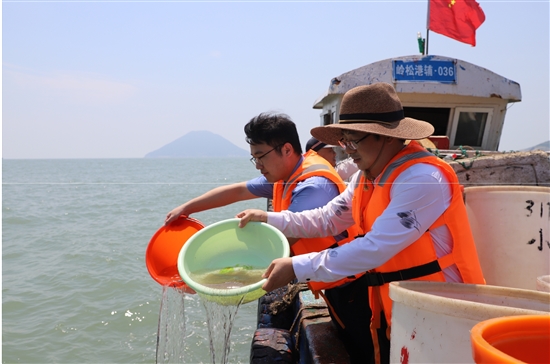 本报讯(通讯员江文辉文/图)为修复振兴东海渔场,保持海洋生物多样性,6月23日上午,市港航口岸和渔业管理局在松门镇积谷山海域开展渔业资源增殖放流活动,8749万尾日本对虾“安家”东海。