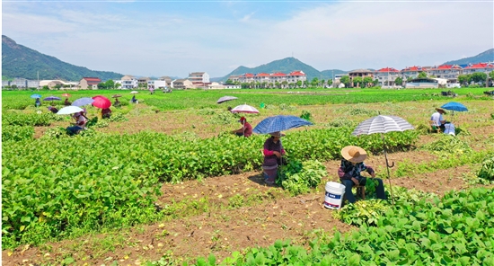 石桥头镇充分发挥农民种植毛豆传统技术和销售大户从事蔬菜贩销的产业链市场优势,积极种植毛豆等经济作物,通过供销产业链提升种植效益,帮助农民增加收入。图为土坦新村种菜大户正组织雇工采摘早毛豆。