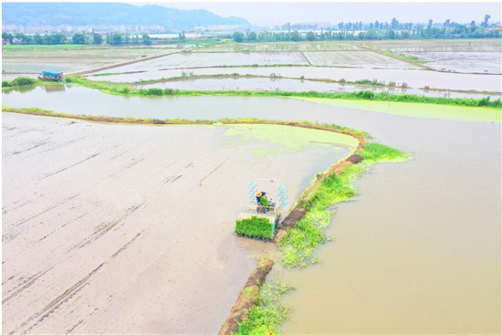 6月24日,坞根镇新方村,种粮大户正驾驶插秧机栽插晚稻秧苗。
