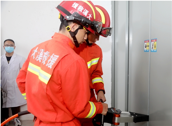为提升特种设备突发事故应急处置能力,近日,大溪镇应急办、大溪市场监管分局、大溪消防中队、大溪卫生院等联合开展特种设备突发事故抢险救援演习暨电梯事故应急救援演练。图为救援人员正在演练破拆轿厢。