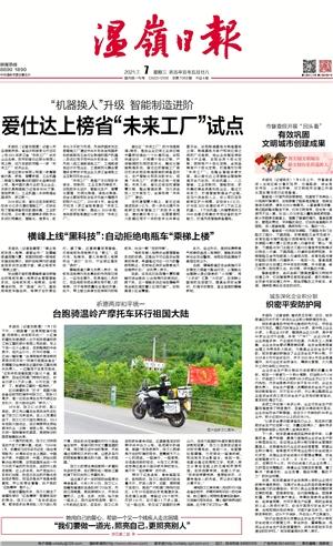 本报讯(记者刘振清)7月5日下午,一辆挂着“台湾同胞骑行祖国 两岸同心共筑和平统一”小红旗的摩托车缓缓驶入位于城东街道的浙江钱江摩托股份有限公司总部。车上下来一位个头墩实、皮肤黝黑的中年男子,他风尘仆仆,打开行李箱,一边将一幅写着“台湾同胞祈愿海峡两岸早日和平统一而骑行祖国各省会”的横幅交给等候在这里的钱江摩托相关负责人,一边掩饰不住激动地说,“这车伴我走遍祖国大陆32个省、直辖市、自治区和澳门特别行政区,安全行驶3.1万多公里,今天它回‘娘家’了。感谢钱江摩托一路相伴。”