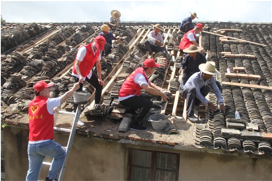 本报讯(通讯员方媛媛/文 金云国/图)7月6日上午,艳阳高照,一群“红马甲”在城南镇新庄村高山头自然村陈根寿老人的家门口忙碌着,他们或是搅拌水泥,或是在房顶修整瓦片,现场一片热火朝天。