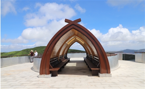 观景平台的造型犹如一朵绽放的花朵,托起即将远行的船舶。在花朵的中心,建有船坞蓬造型长廊,长廊中间装有天窗,长廊里有凳子,爬山爬累了可以坐在里面休息,也可以遮阳避雨。该船坞蓬造型,结合前后出挑的平台,与远处海面上行驶的船只相映成趣,为登高望远的游客们提供了绝佳的观景及休憩点。