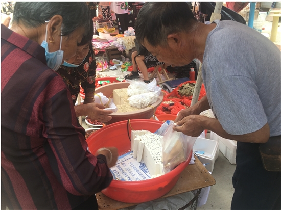 7月7日是农历五月廿八,当天是城东街道横山头街集市日,来自温峤镇中街村的朱仁富在街上卖温岭传统糕点霉糕(或写为“梅糕”,音),他的霉糕售价14元一公斤,有红、白两种。朱仁富说,近几年重操老手艺,在温岭各地赶集销售,受到人们的欢迎。