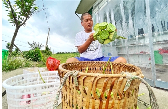 “我们现在每天凌晨5点多就下田。这段时间天气炎热,再加上采摘量还没正式上来,所以不会整天开采,采满一定的量便收工,防止中暑。”经过近半个小时的采摘,蒋金盛又一次背着满满一筐莲蓬回到岸边。