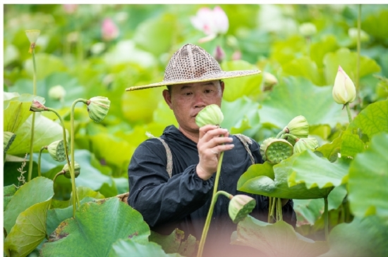“莲蓬要及时采摘,不然会影响莲子的口感。”今年是蒋金盛采摘莲蓬的第九个年头。荷花茎叶上全是小刺,蒋金盛偶尔会被刺到,但他随意地搓一下手指,便继续采摘。