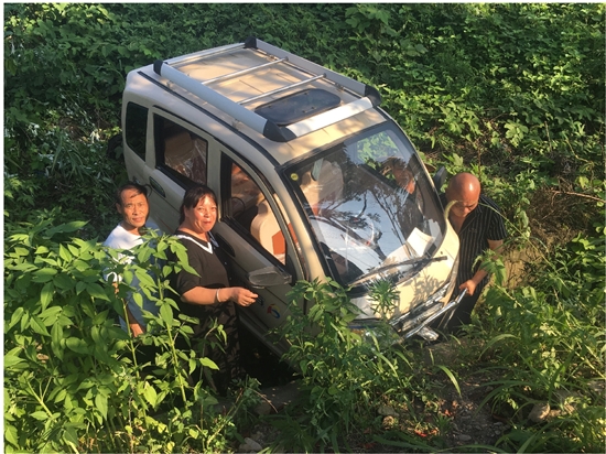 7月7日下午,记者在石松一级公路城东街道紫皋村涵洞东约五六十米处看到,一辆“百事利”电动三轮老人代步车车头坠入路基下的水泥沟中。原来,泽国镇珠山村4位老人共乘这辆车到新河镇硐天新村屿头看长山章氏修谱戏。看戏回家途中,电动车不慎从辅道冲出,冲到3米左右高的岸坎下,车上4位老人(两男两女)不同程度受伤,所幸均无大碍。闻讯赶到现场的老人亲属在紫皋村当地村民等的帮助下,将车头栽入沟中的车子抬到路面上,该车已不能正常行驶。