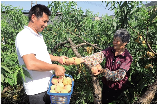 本报讯(通讯员林绍禹文/图)7月9日,在新河镇山园村村民王军良的60亩桃园里,放眼望去,一个个水蜜桃压弯枝头。走近桃树,轻轻拧下一个桃,清洗后撕开薄薄的表皮,嘬一口汁多甘厚、味浓香溢、似浆如露的果肉,无疑是夏天里的一大享受。