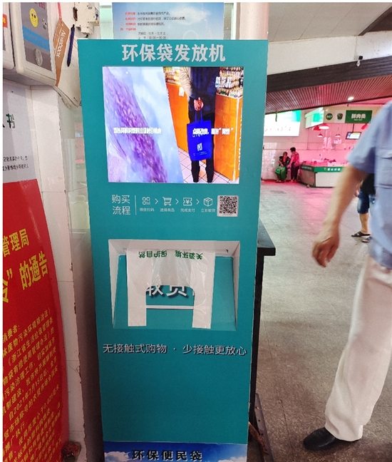 市区万昌菜场内,每个摊位上都已放置生物可降解袋,市民也可通过环保袋发放机,扫码领取。