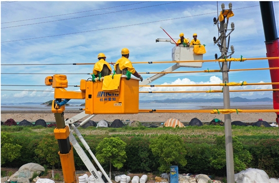 7月16日,国家电网温岭市供电公司不停电作业班工人在石塘镇抢修更换10千伏新竹线、长礁线外力影响受损断杆。