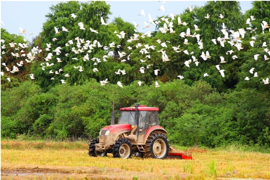 7月18日,东浦新塘箬横镇一种粮大户的农田里,数台拖拉机在翻耕稻田,数百只白鹭、牛背鹭等鸟围在边上嬉戏觅食,形成一幅“铁牛忙耙地,白鹭伴‘双夏’”的美丽画面。