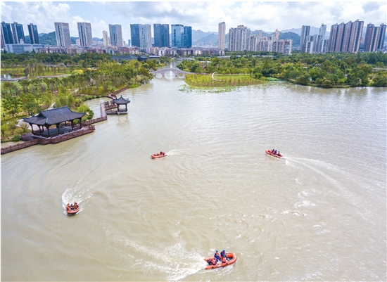 7月20日上午,市消防救援大队联合蓝天救援队在九龙汇公园开展水域救援演练。60多名救援队员协同合作,围绕冲锋舟水上编队搜救、水域救援、攀爬横渡等项目进行训练,以此增强队伍联动配合的实战经验,强化防汛应急处置能力,全力迎战今年第6号台风“烟花”。