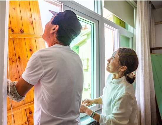 7月21日上午,石塘镇海利村的村民正将一块块实木板安装到窗户外层。由于房子离海岸不到10米,村民提前给窗户加上“保护层”,防止台风掀起的巨浪将玻璃砸碎。