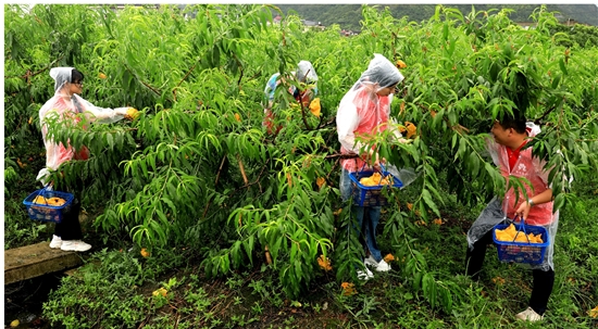 7月22日,在新河镇山园村,镇里的党员、团员和巾帼志愿者披着雨衣,在风雨中忙着帮种植大户抢收桃子,并协助种植户运输和分装,以减少台风带来的经济损失。 通讯员 林绍禹摄