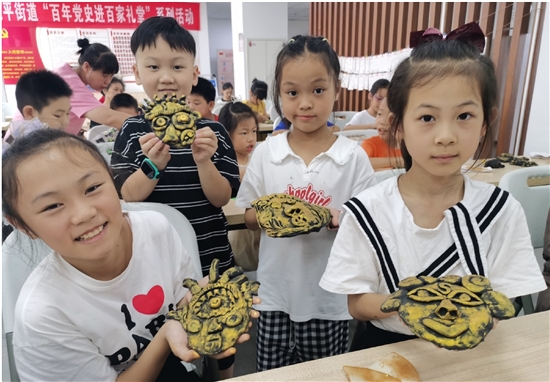 7月27日,在太平街道月河社区文化家园内,20余名儿童展示他们刚刚制作的脸谱作品。