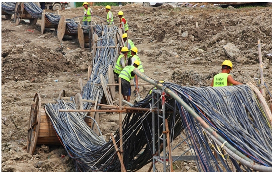7月30日,杭台高速铁路温岭火车站,中国铁路通信信号股份有限公司工人正在敷设信号电缆,这标志着杭台高铁温岭段信号专业全面进入电缆敷设阶段。