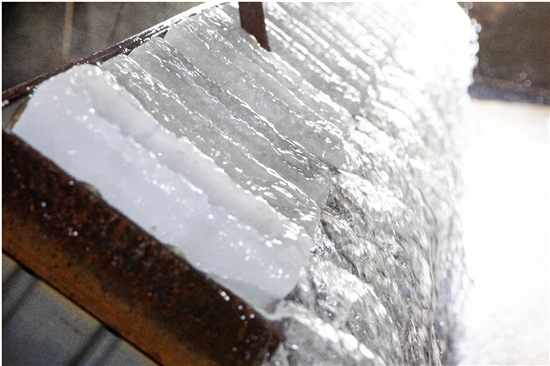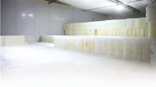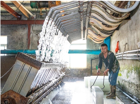 “我们加的水都是长潭水库、湖漫水库的水,通过液氨连续制冷12个小时左右,把整个冰池的水降至-17℃以下。”温岭市宏晟制冰厂负责人潘笃方告诉记者,“制冰就像蒸馒头一样,温度很重要,制冰时要把温度慢慢降下来,这样制出来的冰块不容易断。”