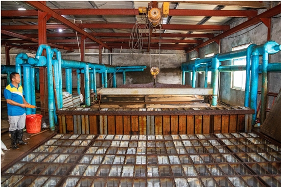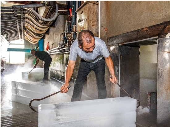 原来以为在制冰厂工作会非常凉快,实际上走进制冰车间,里面的气温和外边差不了多少,真正冷的其实是冰厂的储冰室,在高温和零下气温间不断穿行,才是这个职业最难熬的时刻。制冰车间就像是一个大型的“冰窖”,里面排放着整整齐齐的冰模子。工人熟练地操作吊机将冰模子吊出,放入化冰区进行脱模,“大冰棍”咕嘟咕嘟冒出水面离开模具,另外几位工人紧接着手拿铁钩子用力一拖,一块块100斤左右的大冰块就陆陆续续被推入冰库,随后,制冰模具又重新被注满水,放回冰池开始制冰。