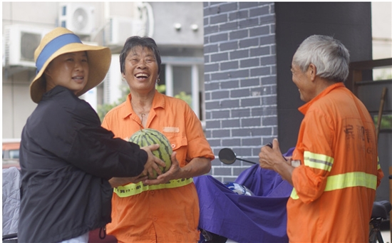 “最近这段时间,天气太过闷热,不要说清扫了,就是在太阳底下站一会儿,也会汗流浃背。”陈秋香坦言,有时候一两瓶水都不够她喝,志愿者们送来的西瓜,她打算带回家,和老伴一起分享,“尽管老伴退休了,但他始终是一名环卫工人,这份送给我们环卫工人的心意,我们都有份。”